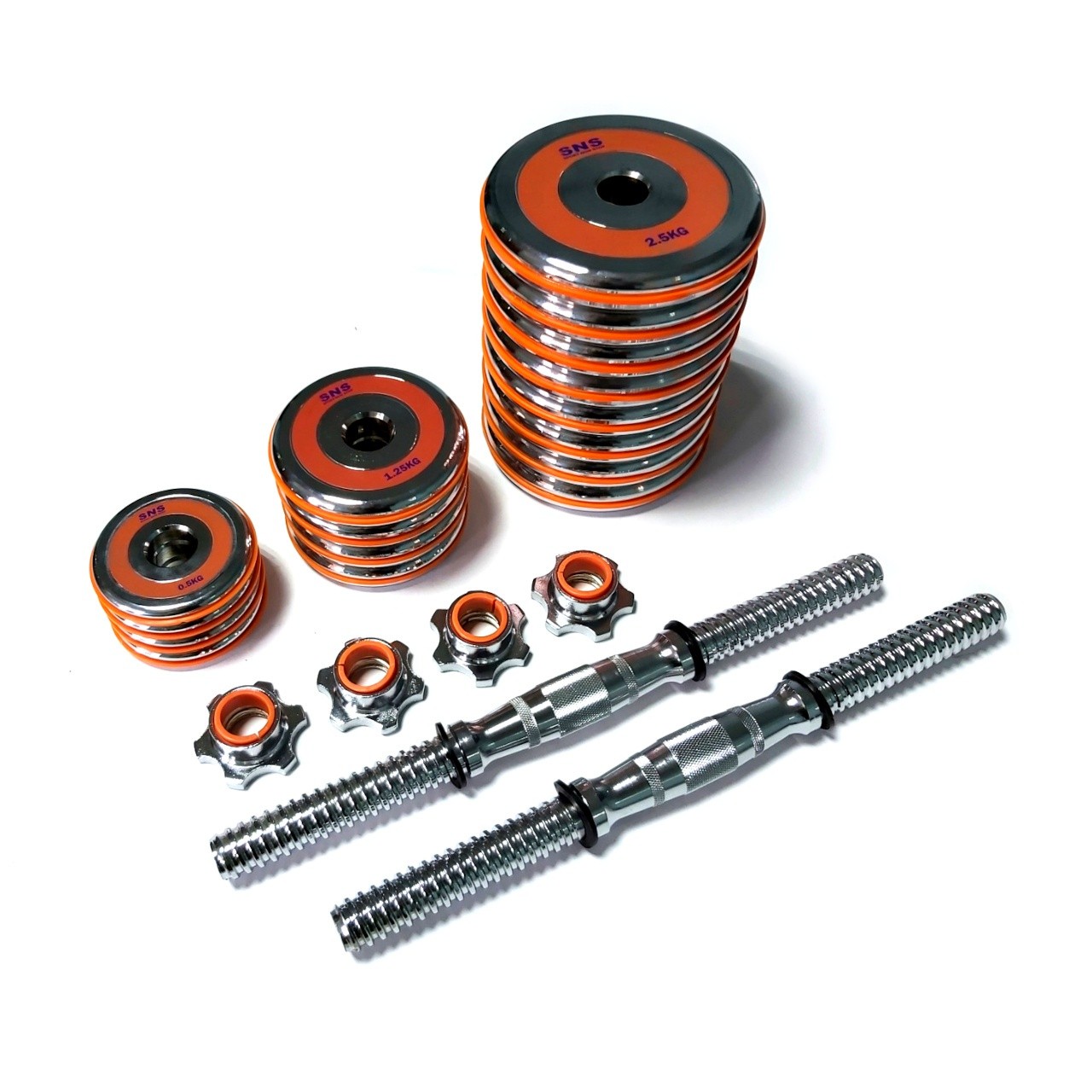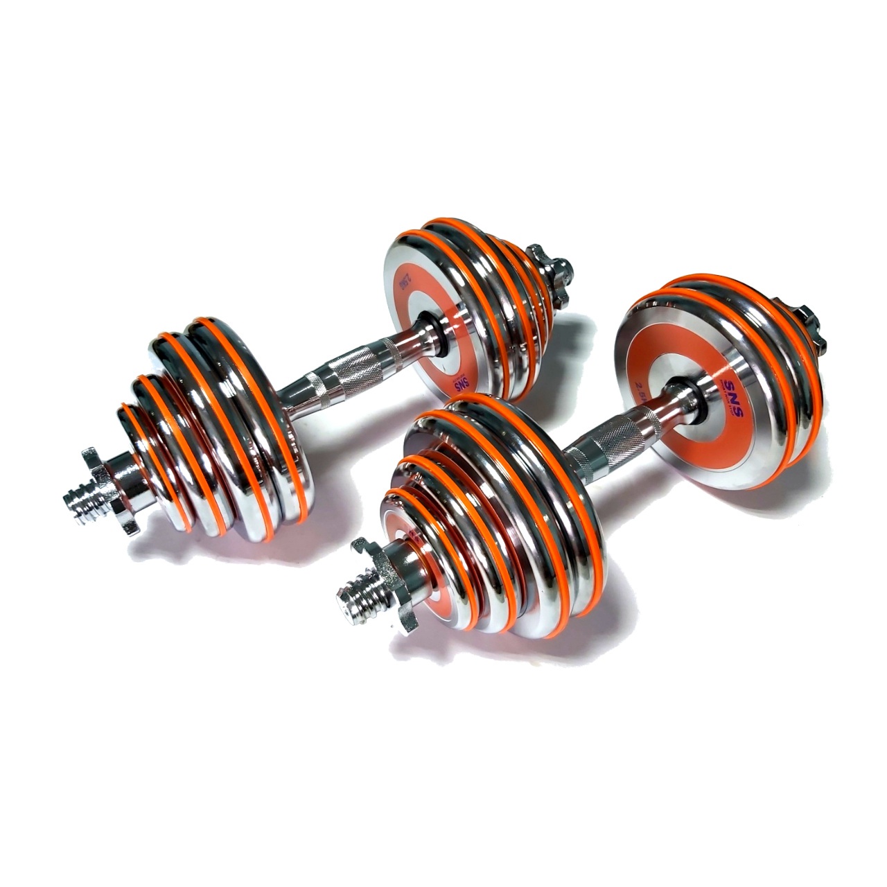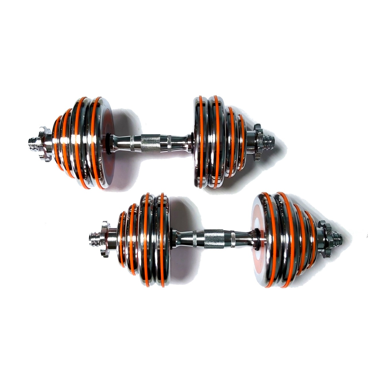 Гантелі розбірні виконані із хромованої сталі. Легка зміна дисків дозволить швидко підібрати оптимальну для себе вагу. Кожен диск доданий оранжевим демфером. Гантелі набір із двох штук допоможуть дзеркально опрацювати м’язи, вони зручні у використанні. Гантелі мають гриф із насічками, що забезпечує більше зчеплення з долонями.