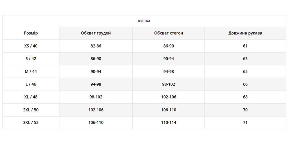 | Розмір | XS, S, M, L, XL, XXL, 3XL |