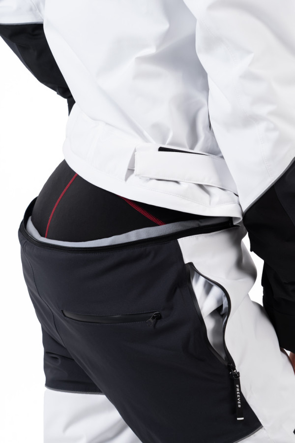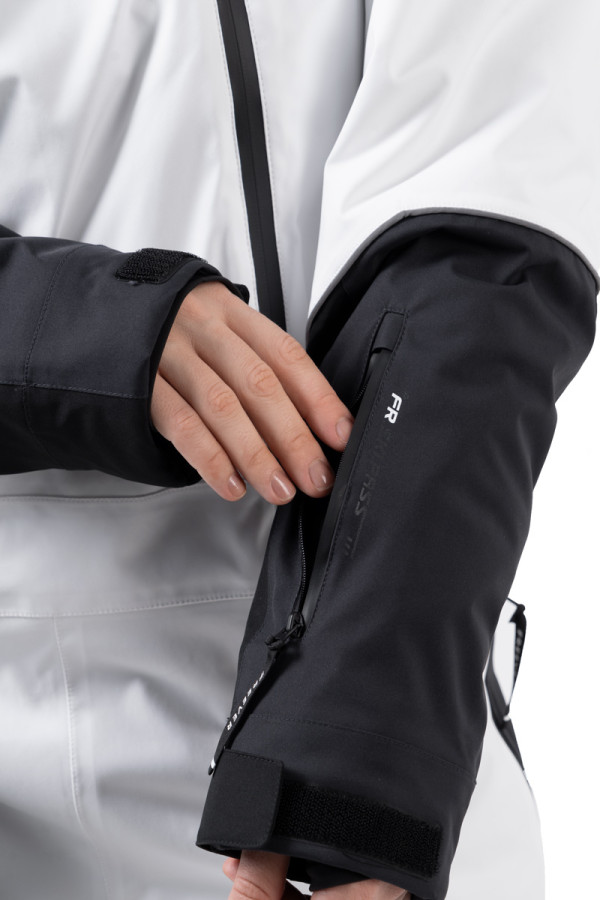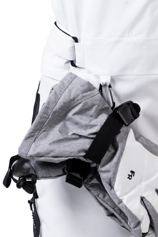Функціональні особливості включають водонепроникні блискавки, регульований пояс, снігозахисну спідницю, вентиляцію, внутрішній манжет і коліна для артикулювання для стабільної посадки в стійках. Незнімне хутро по капюшону додає стильний акцент і зберігає тепло обличчя та шиї. Практичний розподіл кишень (2 внутрішніх та 5 зовнішніх) дозволяє безпечно розміщувати все необхідне на схилі. Білий колір – преміальний, яскравий, ефектний і максимально помітний на трасі, підкреслюючи жіночність та впевненість у катанні.